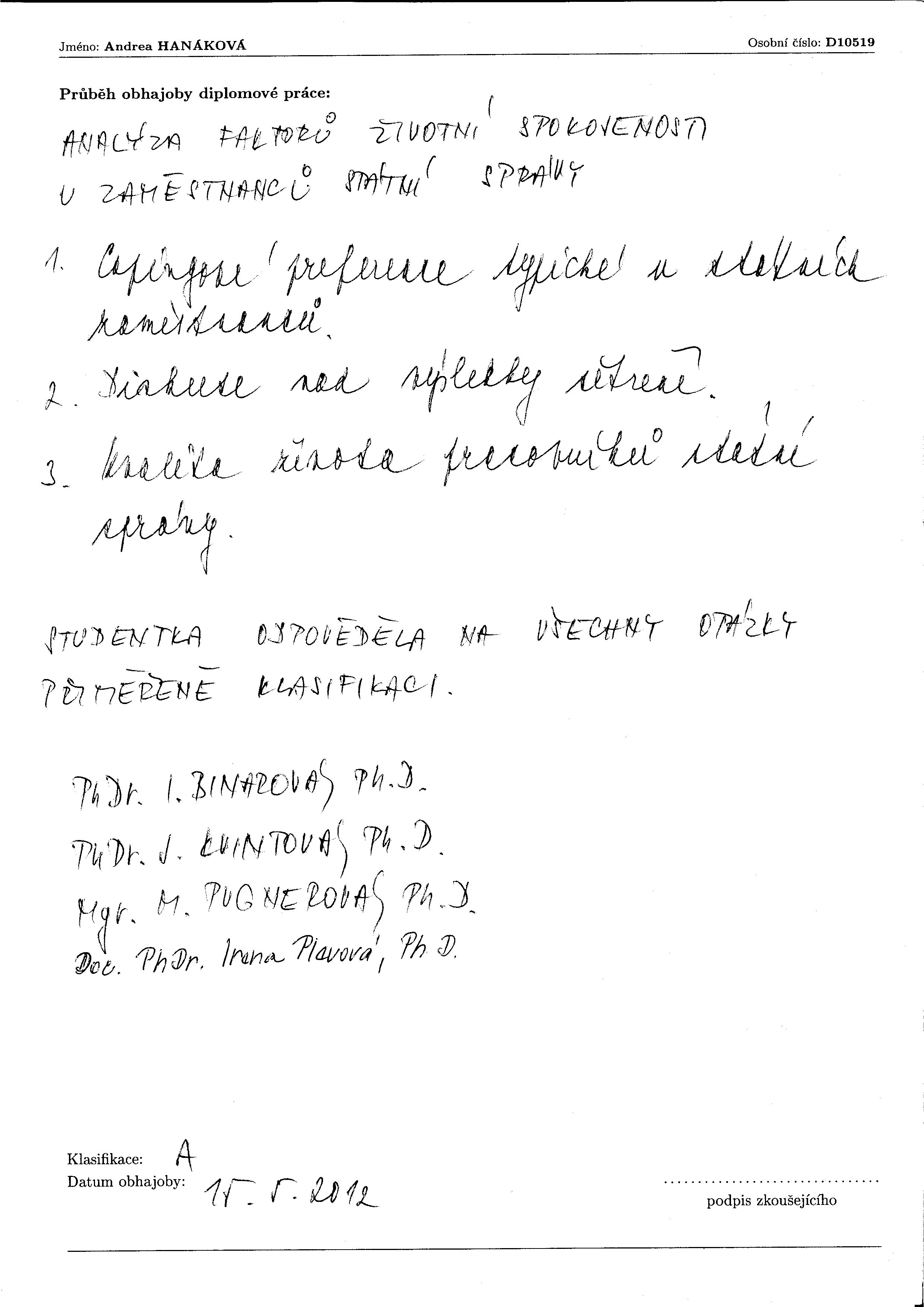 Údaje o názvu Analýza faktorů životní spokojenosti a strategie zvládání stresu u zaměstnanců státní správy [rukopis] / Andrea Hanáková Další variantní názvy Analýza faktorů životní spokojenosti u zaměstnanců státní správy Osobní jméno Hanáková, Andrea (Autor diplomové práce nebo disertace) Překl.náz The analysis of the factors of life satisfaction and the strategy of managing stress by the clerks of public administration Vyd.údaje 2012 Fyz.popis 90 s. (149246 znaků), 8 s. př. : grafy, tab. Poznámka Ved. práce Michaela Pugnerová Oponent Jana Kvintová Dal.odpovědnost Pugnerová, Michaela, 1966- (Vedoucí diplomové práce nebo disertace) Kvintová, Jana, 1974- (Oponent) Dal.odpovědnost Univerzita Palackého. Pedagogická fakulta. Katedra psychologie a patopsychologie (Udělovatel akademické hodnosti (instituce)) Klíč.slova Pozitivní psychologie * životní spokojenost * stres * coping * státní správa * Positive psychology * life satisfaction * stress * coping * public administration Forma, žánr diplomové práce master's theses MDT (043)378.2 Země vyd. Česko Jazyk dok. čeština Druh dok. PUBLIKAČNÍ ČINNOST Titul Mgr. Studijní program Navazující Studijní program Pedagogika Studijní obor Pedagogika - veřejná správa