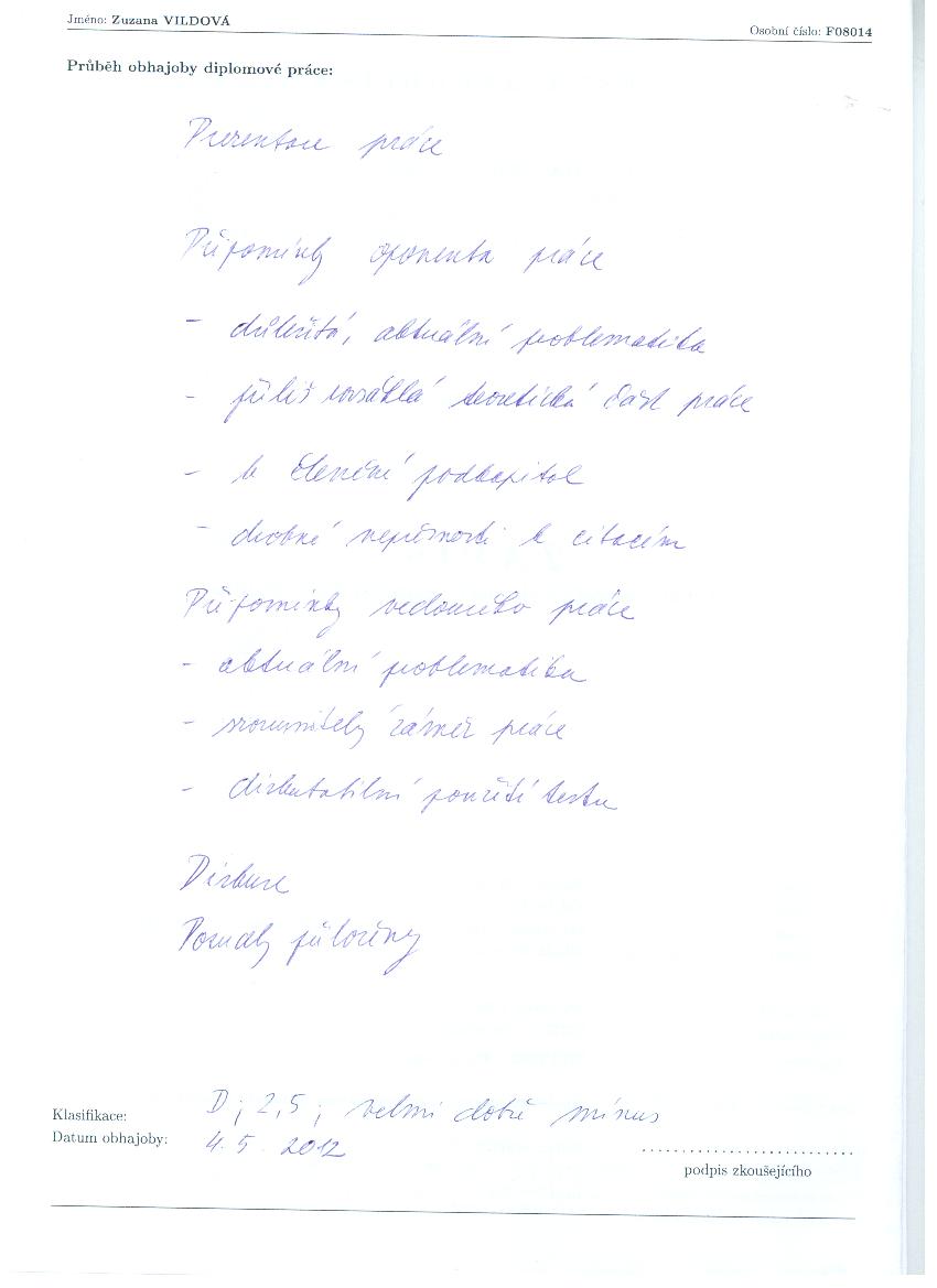 Kvalifikační práce Staženo Velikost datum zpřístupnění 00171145-334671459.pdf 156 538.4 KB 28.03.2012 Posudek Typ posudku 00171145-ved-300106260.pdf Posudek vedoucího 00171145-opon-625656507.doc Posudek oponenta Průběh obhajoby datum zadání datum odevzdání datum obhajoby přidělená hodnocení typ hodnocení 00171145-prubeh-818986041.jpg 11.10.2011 28.03.2012 04.05.2012 2 Hodnocení známkou