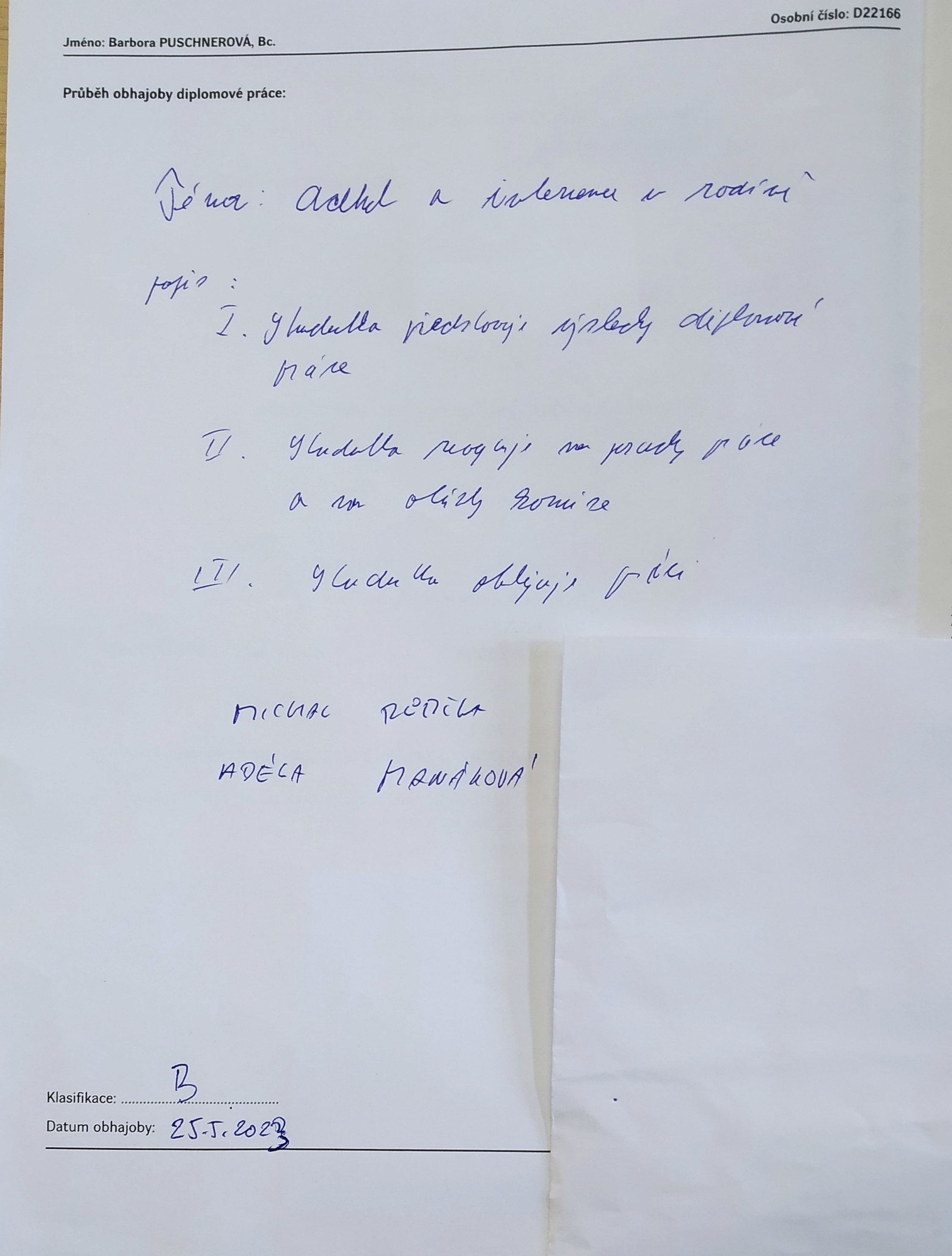 Údaje o názvu ADHD a intervence v rodině [rukopis] / Barbora Puschnerová Další variantní názvy ADHD a intervence v rodině Osobní jméno Puschnerová, Barbora, (Autor diplomové práce nebo disertace) Překl.náz ADHD and family intervention Vyd.údaje 2023 Fyz.popis 60 s. (108 109 znaků) : grafy, schémata, tab. Poznámka Ved. práce Michal Růžička Oponent Jiří Kantor Dal.odpovědnost Růžička, Michal (Vedoucí diplomové práce nebo disertace) Kantor, Jiří (Oponent) Dal.odpovědnost Univerzita Palackého. Ústav speciálněpedagogických studií (Udělovatel akademické hodnosti (instituce)) Klíč.slova ADHD * intervence * rodina * dospělí s AHDH * děti s ADHD * ADHD * intervention * family * adults with ADHD * childrens with ADHD Forma, žánr diplomové práce master's theses MDT (043)378.2 Země vyd. Česko Jazyk dok. čeština Druh dok. PUBLIKAČNÍ ČINNOST Titul Mgr. Studijní program Navazující Studijní program Speciální pedagogika pro 2. stupeň základních škol a střední školy Studijní obor Speciální pedagogika pro 2. stupeň základních škol a střední školy / Učitelství výchovy ke zdraví pro 2. stupeň základních škol