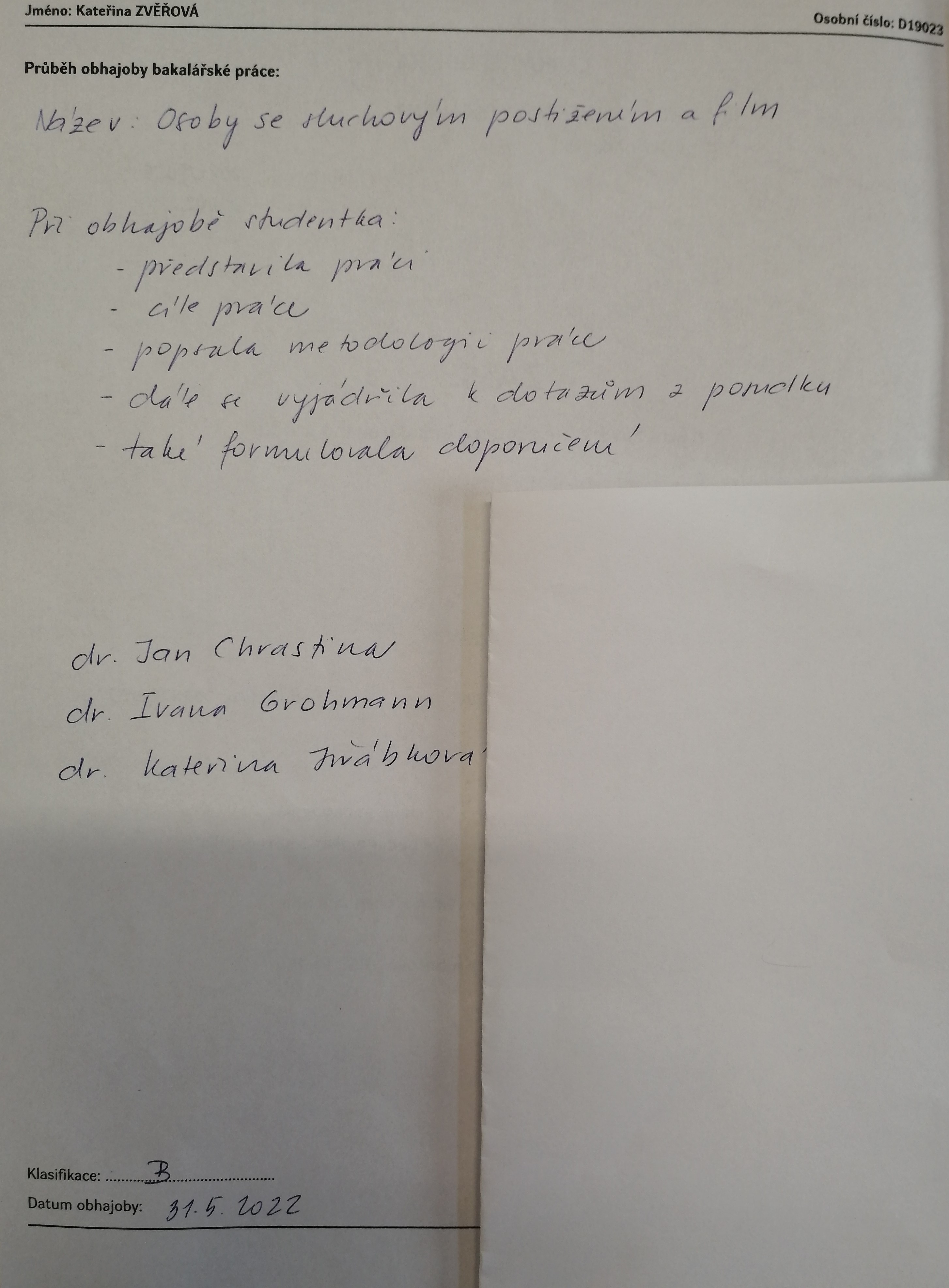 Práce se zabývá zobrazením osoby se sluchovým postižením v kinematografické tvorbě. Cílem práce je analyzovat filmy A Quit Place (2018), A Silent Voice (2016) a Hush (2016), kde se v hlavní roli vyskytuje postava se sluchovým postižením. Práce se zaměřuje na výskyt stereotypů v daných filmech a kompenzačních faktorů, které mohou usnadnit osobám se sluchovým postižením sledování filmu.The bachellor s thesis follows up the depiction of a person with hearing disabilities in cinematographic production. The aim of this thesis is to analyze the films such as A Quiet Place (2018), A silent voice(2016) and Hush (2016), where the main character is a person with hearing disability. The thesis focuses on the existence of stereotypes in given films and assistive factors that can make easier for people with hearing disabilities to watch a film.