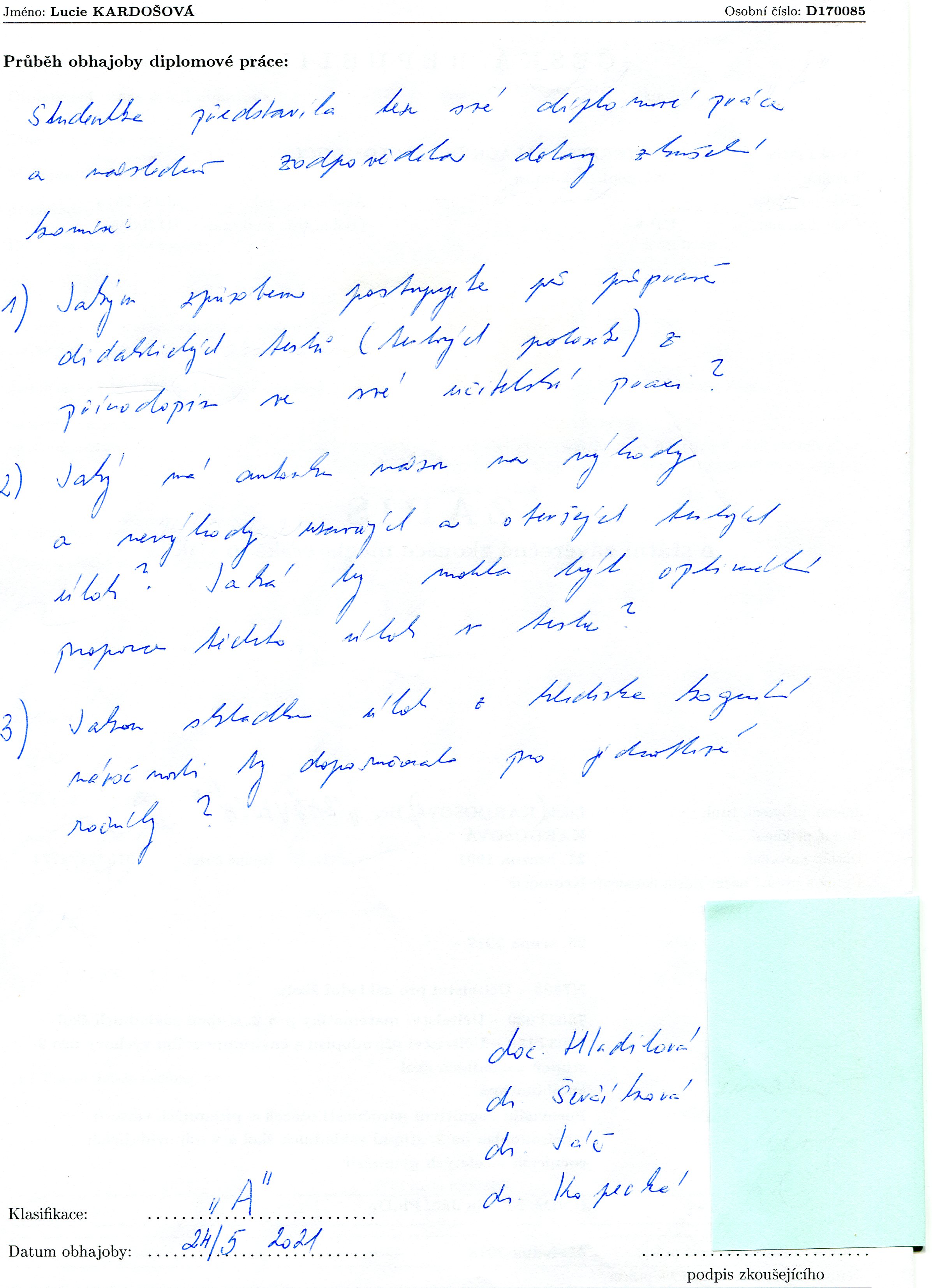 Kvalifikační práce Staženo Velikost datum zpřístupnění 00226499-592469789.pdf 87 1.8 MB 30.04.2021 Posudek Typ posudku 00226499-ved-624819556.pdf Posudek vedoucího 00226499-opon-479928886.docx Posudek oponenta Průběh obhajoby datum zadání datum odevzdání datum obhajoby přidělená hodnocení typ hodnocení 00226499-prubeh-243225752.jpg 31.01.2018 30.04.2021 24.05.2021 1 Hodnocení známkou