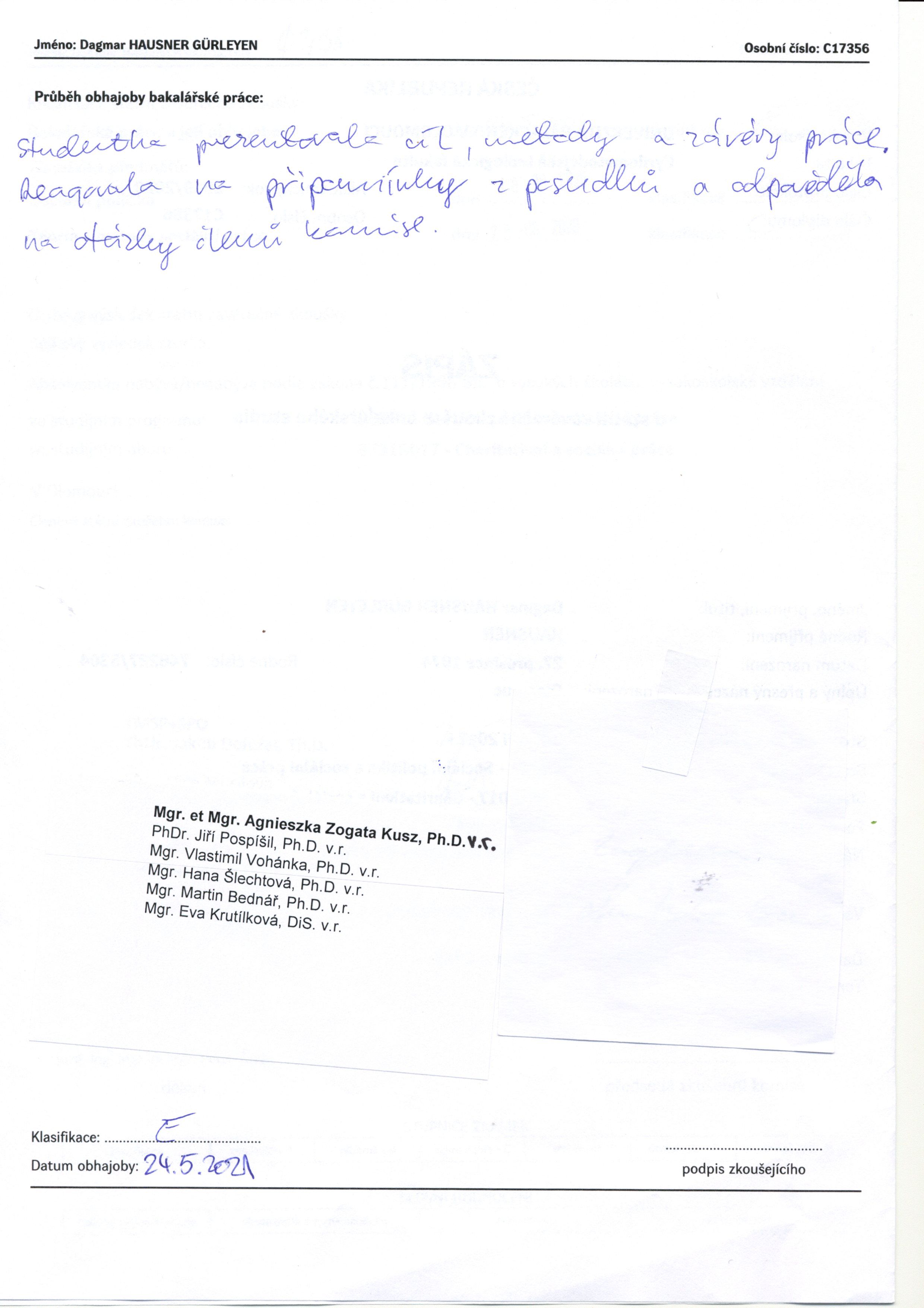Kvalifikační práce Staženo Velikost datum zpřístupnění 00255680-253552743.docx 166 87.4 KB 15.04.2021 Posudek Typ posudku 00255680-ved-152039485.pdf Posudek vedoucího 00255680-opon-698805664.docx Posudek oponenta Průběh obhajoby datum zadání datum odevzdání datum obhajoby přidělená hodnocení typ hodnocení 00255680-prubeh-470264052.jpg 29.09.2020 15.04.2021 24.05.2021 3 Hodnocení známkou