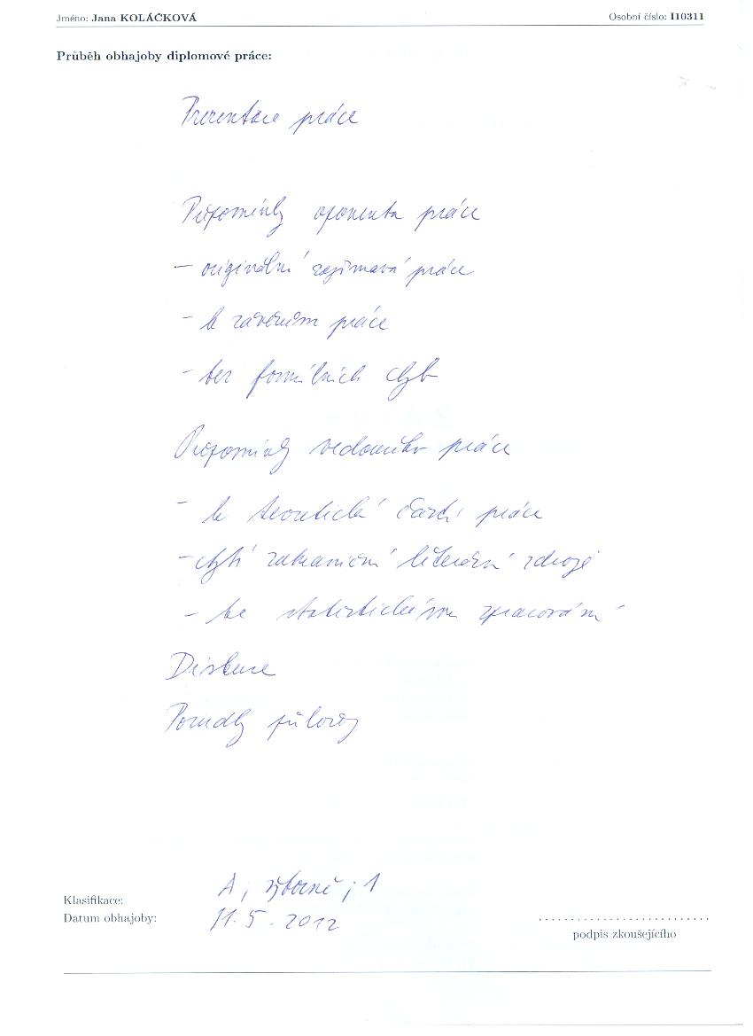 Kvalifikační práce Downloaded Size datum zpřístupnění 00160246-162057573.pdf 34 1.3 MB 31.03.2012 Posudek Typ posudku 00160246-ved-765737148.doc Posudek vedoucího 00160246-opon-138886286.doc Posudek oponenta Průběh obhajoby datum zadání datum odevzdání datum obhajoby přidělená hodnocení typ hodnocení 00160246-prubeh-849153919.jpg 29.04.2010 31.03.2012 11.05.2012 1 Hodnocení známkou