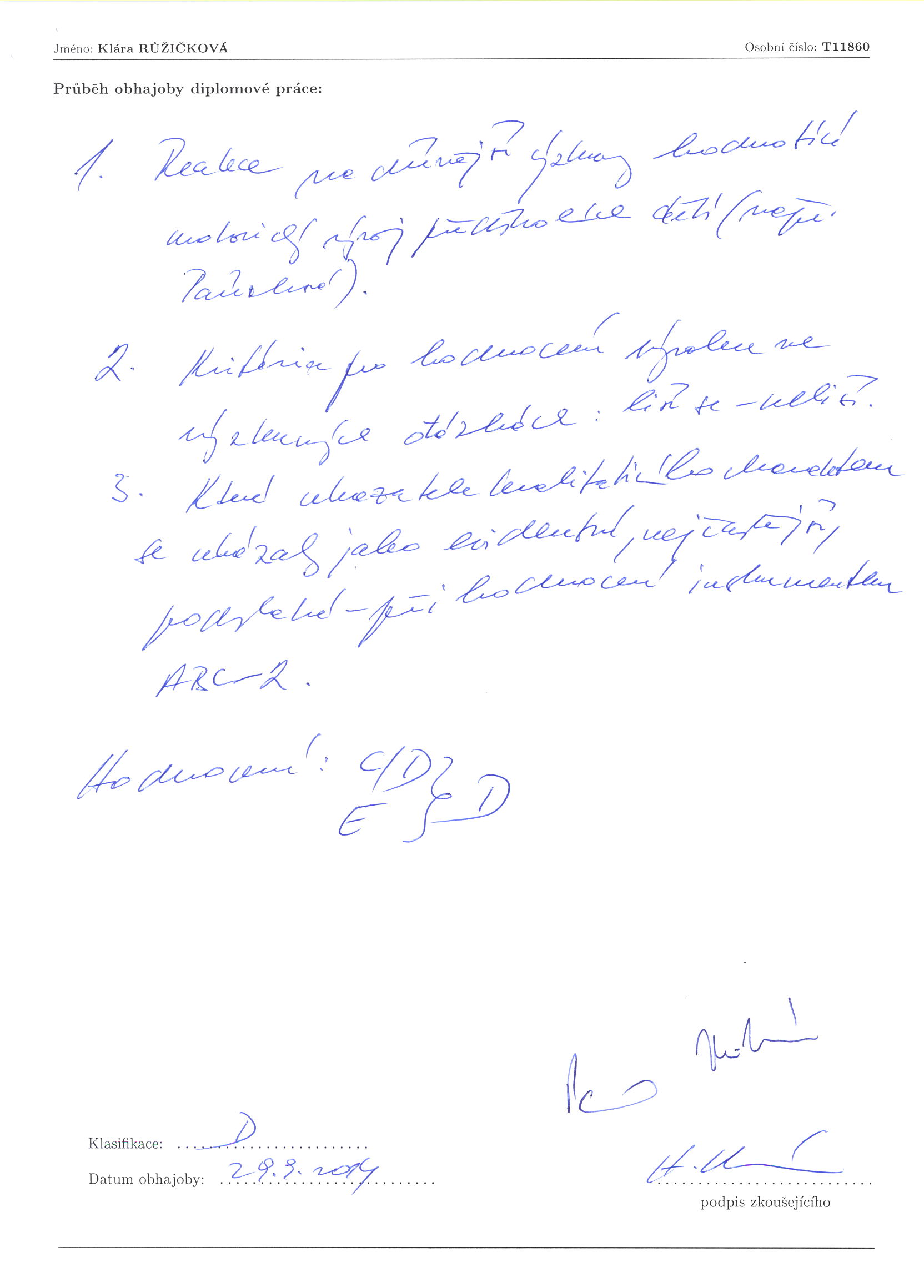 Kvalifikační práce Downloaded Size datum zpřístupnění 00180142-459973728.pdf 109 1.7 MB 28.07.2014 Posudek Typ posudku 00180142-ved-251313596.doc Posudek vedoucího 00180142-opon-973324865.docx Posudek oponenta Průběh obhajoby datum zadání datum odevzdání datum obhajoby přidělená hodnocení typ hodnocení 00180142-prubeh-602378324.jpg 27.11.2012 28.07.2014 29.08.2014 2 Hodnocení známkou