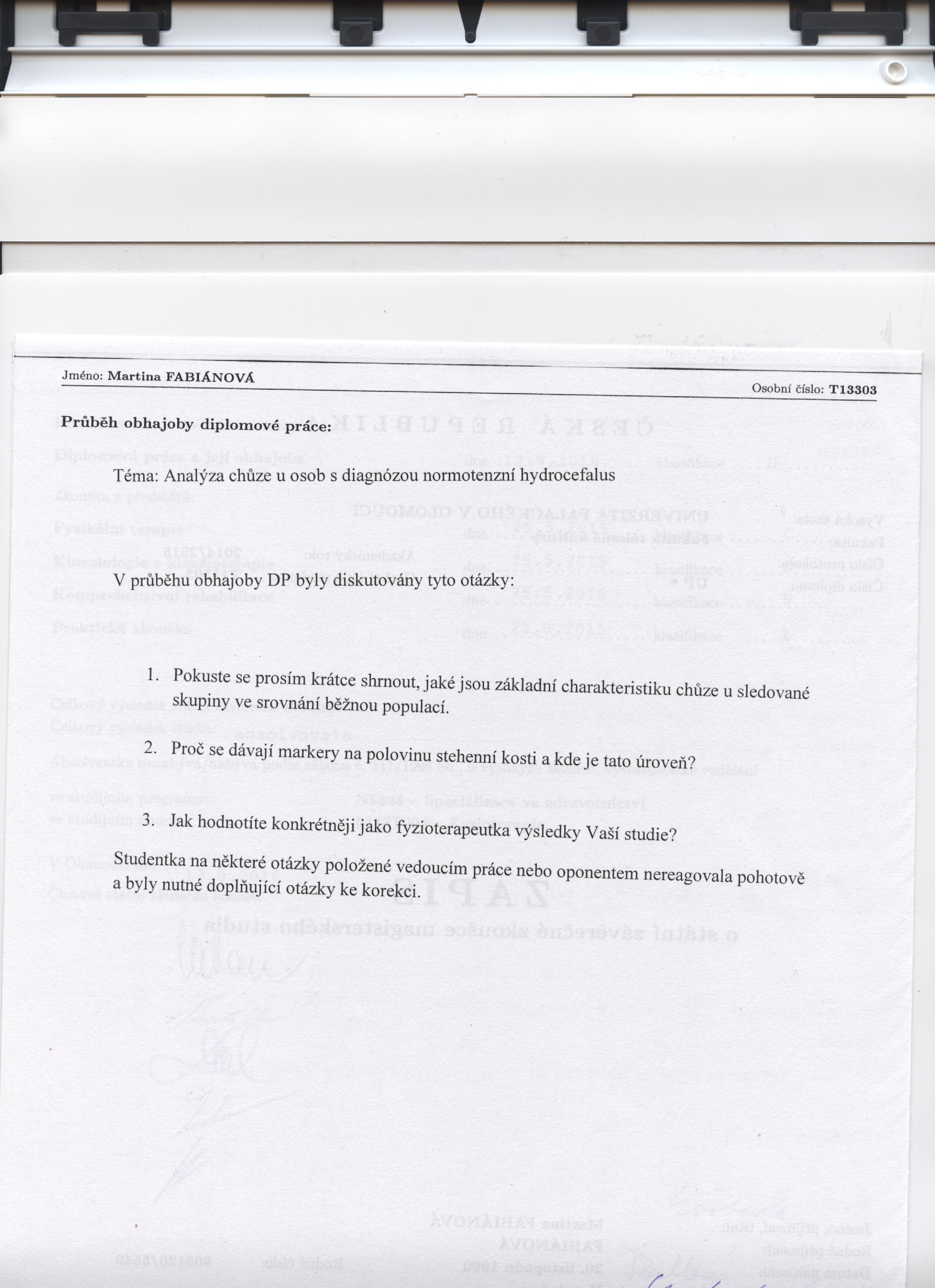 Tato diplomová práce se zabývá analýzou chůze u osob s diagnózou normotenzní hydrocefalus. V teoretické části jsou uvedeny základní poznatky o definici a dělení hydrocefalu, také o diagnostice a léčbě normotenzního hydrocefalu. Samostatná kapitola je věnována chůzi. Motorické poruchy pacientů byly zkoumány analýzou chůze před a po drenážní operaci. Pro potřeby 3D kinematické analýzy byl k posuzování parametrů chůze využit systém Vicon MX, a pro dopočítání časově-prostorových parametrů také silové plošiny Kistler. Našeho měření chůze se zúčastnilo 9 osob s diagnózou normotenzní hydrocephalus, avšak u třech osob nebylo možné provést kontrolní měření 4 až 5 měsíců po operaci pro posouzení efektu operačního zákroku. Výzkumný soubor tedy tvořilo 6 osob (4 muži a 2 ženy, věk 67,2 ? 5,7 let, výška 171,8 ? 14,4 cm, hmotnost 91,5 ? 21,3 kg). Kontrolní měření po operaci proběhlo 4,6 ? 0,8 měsíců po operaci. Cílem diplomové práce bylo zhodnotit motoriku - chůzi pacientů s diagnózou normotenzní hydrocefalus před a po provedené drenážní operaci. Pro porovnání hodnot před a po operaci byl vzhledem k malé velikosti souboru použit neparametrický párový Wilcoxonův test. Věcná významnost byla hodnocena pomocí koeficientu r = Z / N, kde Z je výsledek testového kritéria Wilcoxonova testu a N je celkový počet vzorků. Hodnota r > 0,5 byla uvažována jako velký efekt, hodnota 0,3 < r < 0,5 jako střední efekt. Zjistilo se, že z časově-prostorových parametrů se signifikantně zlepšila frekvence kroku, délka kroku, trvání kroku a rychlost chůze. Co se týče úhlových parametrů dolních končetin a pánve, došlo ke statistickému zlepšení v oblasti hlezenního, kolenního a kyčelního kloubu.This thesis is concerned with the analysis of gait in subjects diagnosed with normotensive hydrocephalus. The theoretical segment states the basic knowledge on the definition and classification of hydrocephalus, including the diagnosis and treatment of normotensive hydrocephalus. A separate section is devoted to gait. Motor disorders of patients were examined by analysis of gait before and after a drainage operation. The Vicon MX system was used for the purposes of 3D kinematic analysis and the assessment of walking parameters; and piezoelectric strength platform by Kistler for the calculation of time-spatial parameters. 9 subjects took part in our measurement of gait, all with the diagnosis of normotensive hydrocephalus, but in respect of three persons it has not been possible to perform the control measurements 4 to 5 months after surgery for the assessment of the effect of the surgical operation. The researched group was therefore comprised of 6 subjects (4 men and 2 women, age 67.2 ? 5.7 years, height 171,8 ? 14,4 cm, weight 91.5 ? 21.3 kg). The aim of the diploma thesis was to evaluate the motor skills - gait in patients diagnosed with normotensive hydrocephalus before and after the drainage operation. Due to the small size of the group, a non-parametric paired Wilcoxon test was used for the comparison of the values before and after the surgery. Material significance was evaluated using the coefficient r = Z / N, where Z represents the result of the test criteria of the Wilcoxon test and N is the total number of samples. The value of r > 0,5 was considered as a great effect, the value of 0,3 < r < 0.5 as a mean effect. It was found that from the point of time-spatial parameters the frequency of the step was improved significantly, as well as the length, duration of the step and the walking speed. As regards the angle parameters of the lower extremities and pelvis, there has been a statistical improvement in the area of the knee and hip joint.
