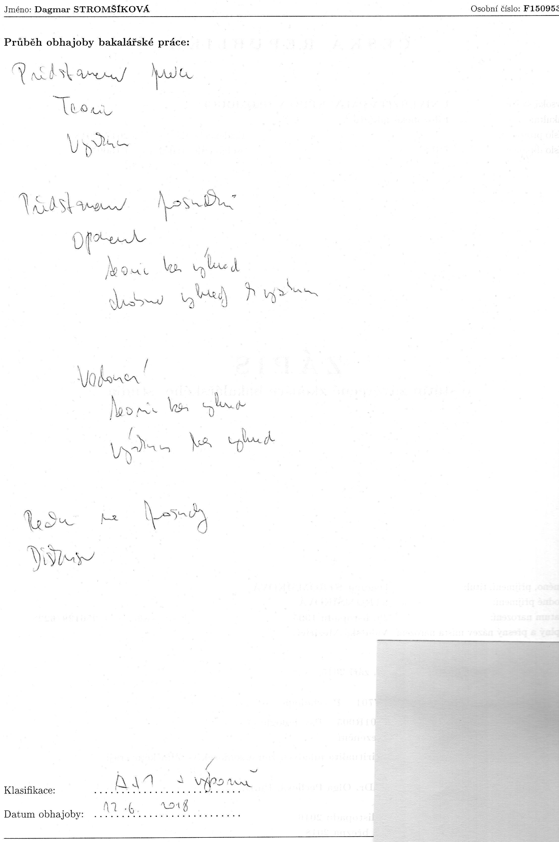 Kvalifikační práce Downloaded Size datum zpřístupnění 00220117-126731222.pdf 29 771.4 KB 28.03.2018 Posudek Typ posudku 00220117-ved-775987534.doc Posudek vedoucího 00220117-opon-700461061.docx Posudek oponenta Průběh obhajoby datum zadání datum odevzdání datum obhajoby přidělená hodnocení typ hodnocení 00220117-prubeh-157463831.jpg 09.11.2016 28.03.2018 12.06.2018 1 Hodnocení známkou