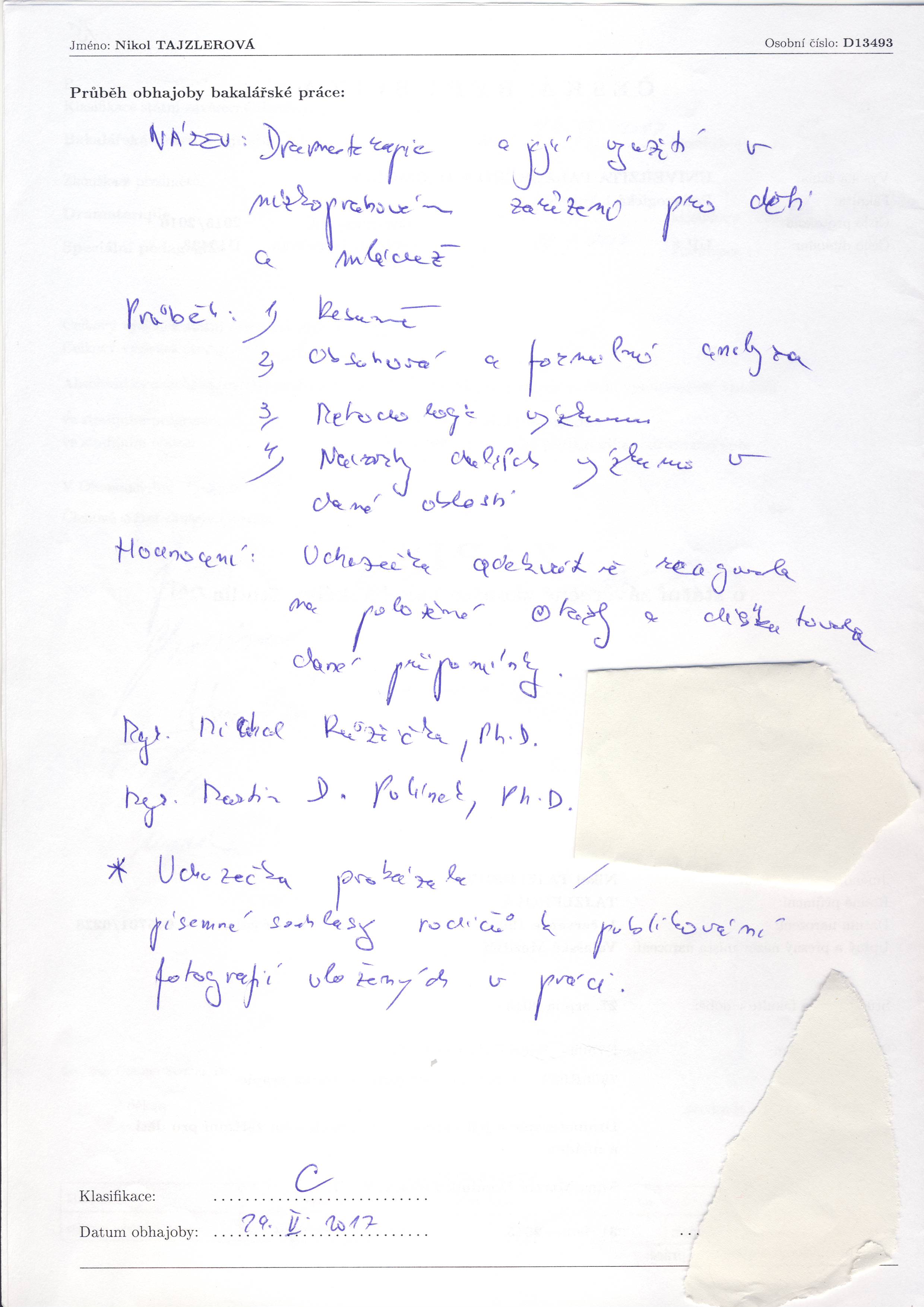Title statement Dramaterapie a její využití v nízkoprahovém zařízení pro děti a mládež [rukopis] / Nikol Tajzlerová Additional Variant Titles Dramaterapie a její využití v nízkoprahovém zařízení pro děti a mládež Personal name Tajzlerová, Nikol (dissertant) Translated title Dramatheraphy and its utilization in low-threshold theatment programmes for children and youth Issue data 2017 Phys.des. 34 stran : portréty Note Ved. práce Martin Dominik Polínek Another responsib. Polínek, Martin Dominik, 1977- (thesis advisor) Another responsib. Univerzita Palackého. Ústav speciálněpedagogických studií (degree grantor) Keywords Dramaterapie * expresivní terapie * nízkoprahové zařízení * dramatherapy * expressive therapy * low-threshold institution Form, Genre bakalářské práce bachelor's theses UDC (043)378.22 Country Česko Language čeština Document kind PUBLIKAČNÍ ČINNOST Title Bc. Degree program Bakalářský Degree program Speciální pedagogika Degreee discipline Speciální pedagogika - dramaterapie