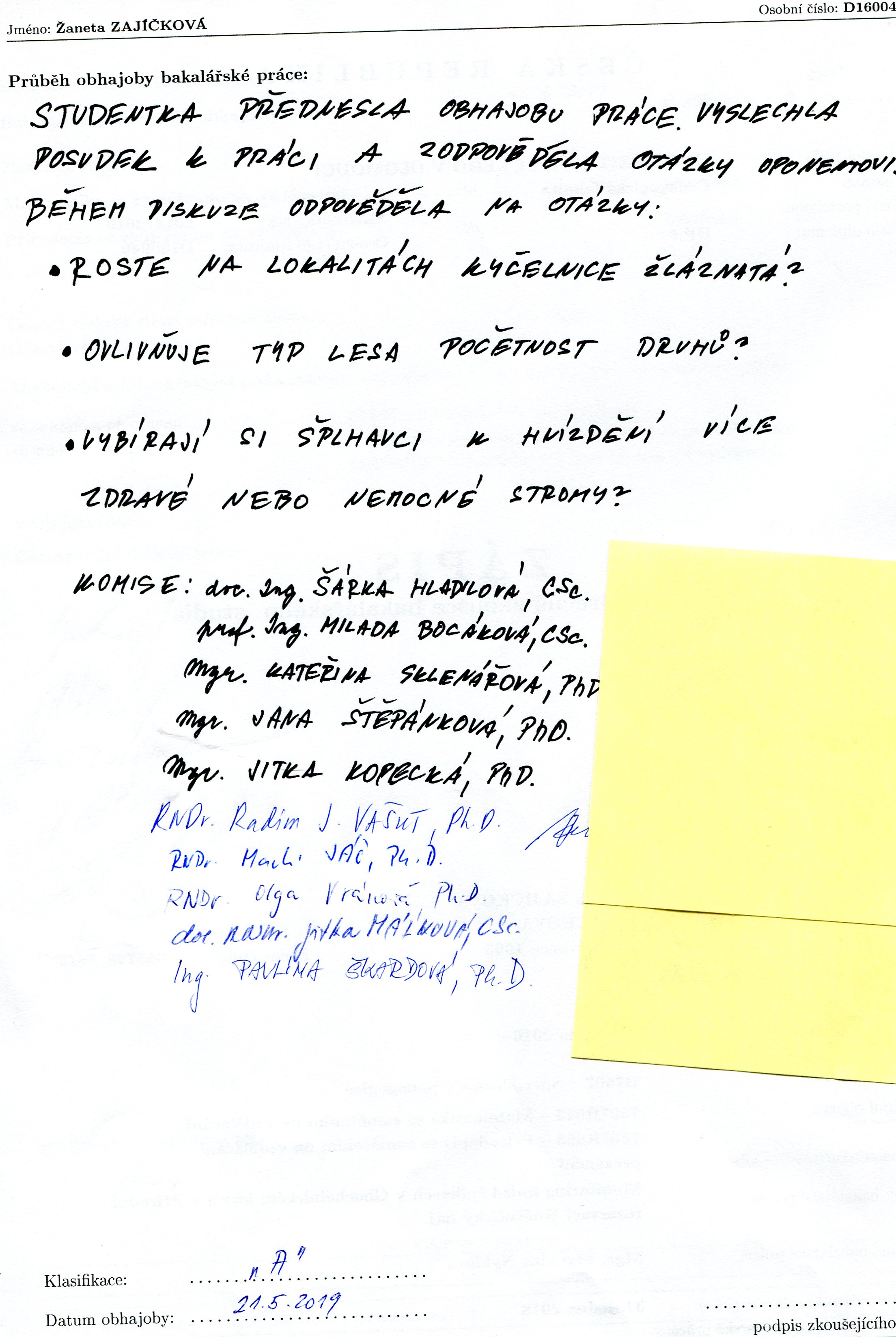 Tato bakalářská práce se zabývá monitoringem hnízdišť šplhavců ve dvou vybraných lokalitách v Moravskoslezském kraji. Součástí je také určení a pozorování způsobu života šplhavců (Piciformes), v uvedených lokalitách. V teoretické části se krátce věnuji charakteristice Přírodní rezervace Hněvošický háj a Chuchelenského lesa. Dále jsem se zabývala popisem řádu šplhavci, jeho taxonomickému zařazení a podrobnému popisu sledovaných druhů - datel černý (Dryocopus martius), žluna zelená (Picus viridis), strakapoud velký (Dendrocopus major), strakapoud prostřední (Dendrocopus medius). V závěrečné části rešerše jsem popsala ochranu ptactva v rámci České republiky a metody jejich správného pozorování. V praktické části jsem se zabývala lokalizací (GPS) aktivních dutin v rámci vymezených oblastí. Určila jsem celkové množství dutin od všech zmíněných druhů. Stanovila jsem průměr vletových otvorů a veškerých zjistitelných vlastností hnízdní dutiny. Součástí práce je dokumentace pobytových stop šplhavců, které poslouží k didaktickým účelům.This Bachelor thesis deals with monitoring of woodpecker nesting sites in two selected localities in the Moravian-Silesian region. It also Includes the identification and observation of the way of life of climbers (Piciformes) in the listed localities. In The theoretical part, I describe the Nature reserve Hněvošický Háj and Chuchelená forest. I Also dealt with a description of the order of the climactic woodpecker, its taxonomic classification and a detailed description of the species being watched - the Black Woodpecker (Dryocopus martius), the green Woodpecker (Picus viridis), The Great Spotted Woodpecker (Dendrocopus major), the Middle Spotted (Dendrocopus medius). In the final part of the research, I described the protection of birds within the Czech Republic and described possible methods of research. In the practical Part I dealt with localization (GPS) of active cavities within defined areas. I have determined the total number of cavities from all mentioned species. By Determining the diameter of the onlet holes and any detectable properties of the nesting cavity. Part of the work is the subsequent creation of the collection of the woodpeck traces, which will be used for didactic purposes.