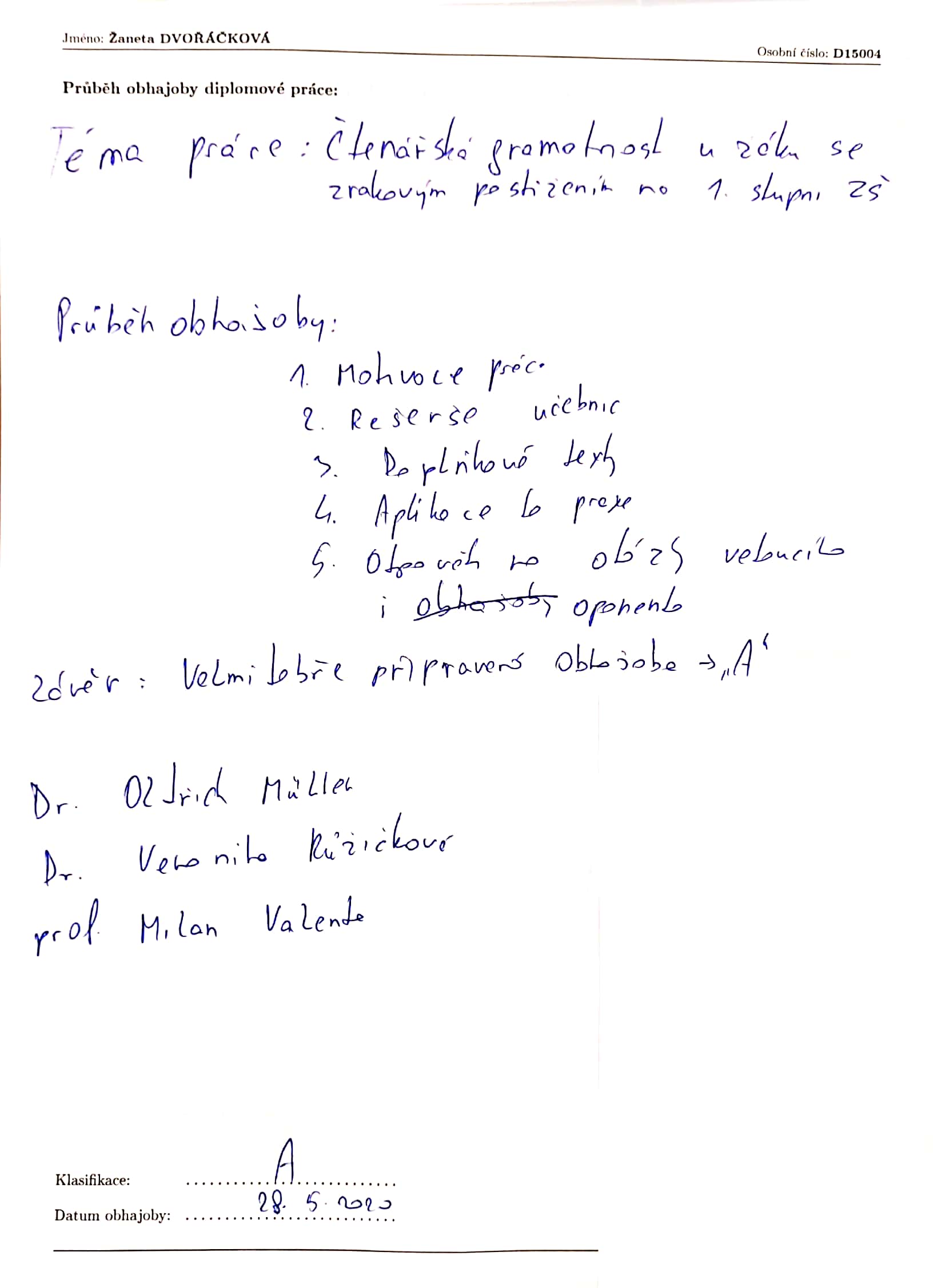 Title statement Čtenářská gramotnost u žáků se zrakovým postižením na 1. stupni základní školy [rukopis] / Žaneta Dvořáčková Additional Variant Titles Čtenářská gramotnost u žáků se zrakovým postižením na prvním stupni základní školy Personal name Dvořáčková, Žaneta, (dissertant) Translated title Reader literacy by pupils with visual impairment at primary school Issue data 2020 Phys.des. 137 s. : il., tab. Note Ved. práce Veronika Růžičková Oponent Kateřina Kroupová Another responsib. Růžičková, Veronika (thesis advisor) Kroupová, Kateřina (opponent) Another responsib. Univerzita Palackého. Ústav speciálněpedagogických studií (degree grantor) Keywords osoba se zrakovým postižením * žák * čtenářská gramotnost * čtenář * kvalitativní výzkum * Person with visual impairment * pupil * reagind literacy * reader * qualitative design Form, Genre diplomové práce master's theses UDC (043)378.2 Country Česko Language čeština Document kind PUBLIKAČNÍ ČINNOST Title Mgr. Degree program Magisterský Degree program Speciální pedagogika Degreee discipline Učitelství pro 1. stupeň základních škol a speciální pedagogika