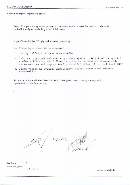 Title statement Vliv pulzní magnetoterapie na aktivitu autonomního nervového systému hodnocený spektrální analýzou variability srdeční frekvence [rukopis] / Věra Müllerová Additional Variant Titles Vliv pulzní magnetoterapie na aktivitu autonomního nervového systému hodnocený spektrální analýzou variability srdeční frekvence Personal name Müllerová, Věra (Dissertant) Translated title The influence of pulsed magnetotherapy on the activity of the autonomic nervous system evaluated by spectral analysis of heart rate variability Issue data 2011 Phys.des. 125 s. : il., grafy, tab. + 1 cd Note Ved. práce Josef Urban Oponent Petr Uhlíř Another responsib. Urban, Josef, 1969-2021 (Thesis advisor) Uhlíř, Petr (Opponent) Another responsib. Univerzita Palackého. Katedra fyzioterapie (Degree granting institution) Keywords Autonomní nervový systém * variabilita srdeční frekvence * krevní tlak * elektromagnetické pole * magnetoterapie * Autonomic nervous system * heart rate variability * blood pressure * electromagnetic field * magnetotherapy Form, Genre diplomové práce master's theses UDC (043)378.2 Country Česko Language čeština Document kind PUBLIKAČNÍ ČINNOST Title Mgr. Degree program Navazující Degree program Specializace ve zdravotnictví Degreee discipline Fyzioterapie
