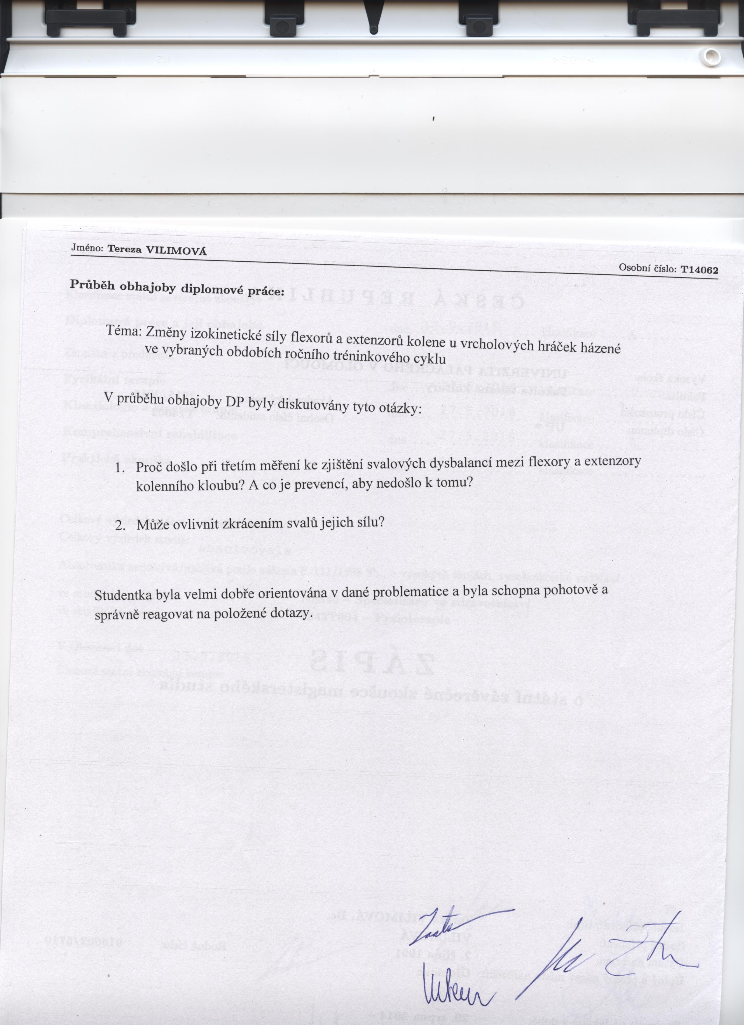 Cílem diplomové práce je posoudit dynamiku změn izokinetické svalové síly flexorů a extenzorů kolenního kloubu ze zdravotního a výkonnostního hlediska se zaměřením na bilaterální a ipsilaterální dysbalance u vrcholových hráček házené na konci soutěžního období, na začátku přípravného období a na konci přípravného období. Svalová síla flexorů a extenzorů kolenního kloubu byla měřena u hráček DHK Zora Olomouc (n=11; průměrný věk 23,09?3,48) na izokinetickém dynamometru IsoMed 2000 (D. & R. Ferstl, GmbH, Hemau, Germany) při úhlové rychlosti 60°/s. Pro vyhodnocení byly použity parametry peak torque (PT - maximální moment síly, [N-m]). Byly hodnoceny ipsilaterální svalové dysbalance konvenčním H/Q poměrem (H/QCON), funkčním H/Q poměrem (H/QFUNC) a funkčním H/Q poměrem (Hcon/Qecc) a bilaterální silový procentuální deficit ve vztahu k silnější DK (%Def). Výsledky Freedmanovy ANOVY ukázaly na signifikantní efekt času na hodnoty PT při koncentrické kontrakci flexorů na dominantní dolní končetině (DDK), extenzorů na DDK a extenzorů na nedominantní dolní končetině (NDK), na hodnoty H/QCON mezi jednotlivými měřeními na DDK a na hodnoty %Def flexorů při koncentrické svalové kontrakci. Hlubší analýza potvrdila signifikantní nárůst hodnot PT při koncentrické kontrakci flexorů na DDK mezi 1. a 3. měřením a 2. a 3. měřením, extenzorů na DDK mezi 2. a 3. měřením a extenzorů na NDK mezi 1. a 3. měřením a 2. a 3. měřením. Hlubší analýzou byl zjištěn také signifikantní nárůst hodnot H/QCON na DDK mezi 1. a 2. měřením a 1. a 3. měřením a signifikantní snížení %Def flexorů při koncentrické svalové kontrakci mezi 1. a 3. měřením a extenzorů při koncentrické svalové kontrakci mezi 1. a 2. měřením. Tyto výsledky ukazují především na dostatečnou stimulaci maximální koncentrické síly flexorů na DDK během přípravného období, která se projevila na snížení jak ipsilaterálních, tak bilaterálních svalových dysbalancí.The objective of the thesis is to assess the dynamics of changes in isokinetic muscle strength of the knee joint flexors and extensors in terms of health and performance, focusing on bilateral and ipsilateral imbalance in elite female handball players at the end of the competition period, at the beginning of the preparatory period and at the end of the preparatory period. Muscle strength of the knee joint flexors and extensors was measured for the female players of DHK Zora Olomouc (n=1; mean age 23,09?3,48) using the isokinetic dynamometer IsoMed 2000 (D. & R. Ferstl, GmbH, Hemau, Germany) at an angular velocity of 60°/s. For evaluation, peak torque parameters were used (PT peak torque, [N-m]). Ipsilateral muscle imbalances were assessed using the conventional H/Q ratio (H/QCON), functional H/Q ratio (H/QFUNC) and functional H/Q ratio (Hcon/Qecc) and bilateral strength percent deficit in relation to the stronger LL (%Def). The results of Freedman's ANOVA revealed a significant effect of time on the PT values during the concentric contraction of the flexors of the dominant lower limb (DLL), of the extensors of the DLL and of the extensors of the nondominant lower limb (NLL), as well as on the H/QCON values between measurements of the DLL and on %Def values of the flexors during concentric muscle contraction. A more detailed analysis confirmed a significant increase of the PT values during concentric contraction of the flexors of the DLL between the first and the third measurements, of the extensors of the DLL between the second and the third measurements and of the extensors of the NLL between the first and the third measurements, and the second and the third measurements. A more detailed analysis also revealed a significant increase in H/QCON values of the DLL between the first and the second measurements, and the first and the third measurements as well as a significant reduction in %Def values of the flexors during the concentric muscle contraction between the first and the third measurements and of the extensors during the concentric muscle contraction between the first and the second measurements. These results show a sufficient stimulation of the maximum concentric strength of the flexors of the DLL during the preparatory period, which was reflected in reduction of both ipsilateral and bilateral muscle imbalances.